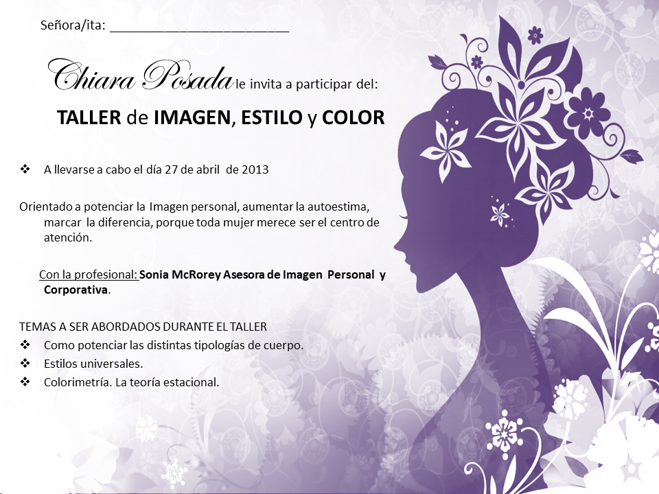 CHIARA POSADAS te invita al TALLER de IMAGEN, ESTILO y COLOR a realizarse en ENCARNACION en fecha 27-04 consultas a chiaraposada@hotmail.com, (0992) 526 460, (0995) 378 518, (0985) 472 015